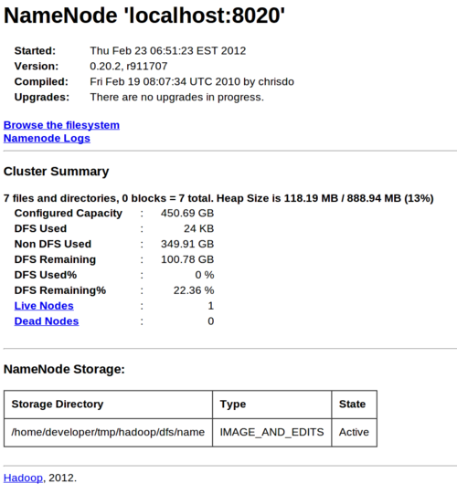 The important items to note on this page are the is a 1 after the Tablet Servers, Live Data Nodes, and Trackers in the “Accumulo Master”, “NameNode”, and “JobTracker” tables, respectively. There should also be entry in the “Zookeeper” table.